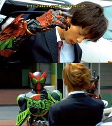 In many way, _Kamen Rider Os_ feels like _Kabuto_ on (even more) crack, in huge part because at a glance the Mysterious Kogami Foundation comes off as very similar to ZECT (and BOARD, to a lesser extent). The motorcyle brigade totally reminds me of ZECTroopers (who in turn are derived from Riotroopers), both in uniform and in how they are sent to attack the Greeed (how many e's??) and subsequently get decimated; the president of the Foundation is like Kagami's father at his loopiest (red shoes, anyone?), while also giving off that same vibe that he knows exactly what is going on and that all of this is part of furthering his own agenda.As for Eiji himself, I may completely change my mind about this, but if he reminds me of any previous Riders, it's probably of a mix between Godai and Shoichi (full disclosure: I have not finished Kuuga). Godai was a sort of drifter by choice (drifter not in the sense of moving around, but in how he seemed to live a lackadaisical sort of life, without putting down roots), and Eiji is much more of an actual literal drifter. As for Shoichi, more in the way of his personality and how he approaches life, I think. Hard to really tell yet, particularly going off a raw episode, but that's the vibe I get.